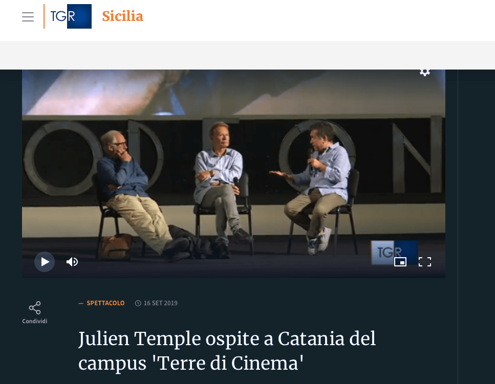 Dopo la fase delle riprese dei videoclip realizzati dagli artisti partecipanti alla residenza artistica del progetto Extended TDC CineMusic Lab 2019, la residenza artistica del progetto Extended TDC CineMusic Lab 2019 si e’ conclusa con masterclass e proiezioni con il regista britannico Julien Temple, uno dei più importanti nomi dell’industria video-musicale mondiale, autore dei videoclip di artisti del calibro di David Bowie, Rolling Stones, Depeche Mode, Duran Duran, Fat Boy Slim. Il podcast dell’edizione del TGR Rai Regione del 16 settembre e’ visionarie al seguente link